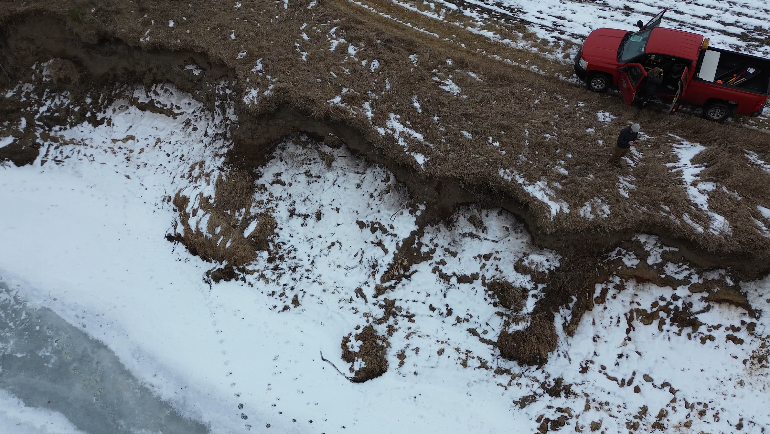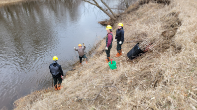 At a new conservation easement along the Rum River in Isanti County, we employed crew members from Conservation Corps MN & Iowa to plant 600 live willow and dogwood cuttings along the toe of an eroding Rum Riverbank. The riverbank is far from any homes or infrastructure. The land behind the riverbank was a corn field that will be planted with native vegetation. Because the risk of loss at this site is so minimal, we opted for a soft, natural approach over expensive hard armoring. The hope is that the planted stakes will take root and grow, establishing dense tree cover along the lower slope. The upper slope will continue to shift until it reaches equilibrium, but if the toe remains in place, the bank will have a chance to heal and fully revegetate over time. Because the investment of time and materials was so low, we can try again if the stakes die from flooding or drought.