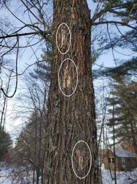 If you notice woodpeckers have been making numerous small exploratory holes up and down an ash tree, it's a good bet that the tree is infested with Emerald Ash Borer. Many such probing holes may be present. This is often first noticed in winter because the lighter-colored damaged areas stand out against the darker bark and are not concealed by leaf cover.