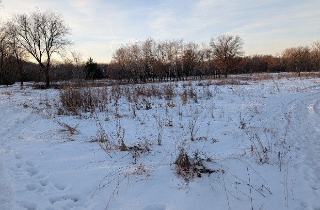 Activities to enhance habitat within 45 acres at Coon Rapids Dam Regional Park began this winter. The dense buckthorn that dominated the understory of the woodlands, wetland depressions, edges of Turtle Pond and the Mississippi River shoreline was cut and mowed. The Siberian elms invading prairie and turf areas were cut and removed, and several box elder trees were cut to create a canopy gap for greater diversity. Enhancement activities, including follow-up buckthorn and garlic control, a prescribed burn, native seeding, and turf-to-prairie conversion, will continue through 2030 with support from the Lessard-Sams Outdoor Heritage Funds.